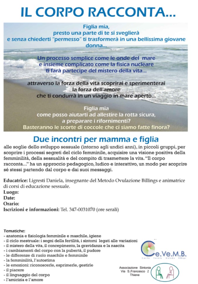 E' attivo il percorso mamma-figlia sui temi di affettivita’ e sessualità, che prevede 2 o 3 incontri con ragazzine di 11/12 anni e le loro mamme. Si parla della trasformazione del corpo nella preadolescenza, della meraviglia della vita, di come gestire le emozioni, del valore dell’amicizia e dell’amore, del rapporto speciale con la mamma.